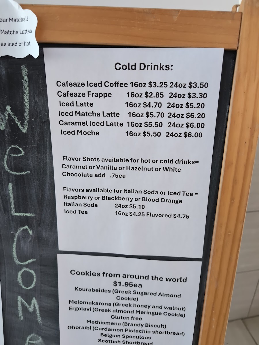 For those who prefer iced drinks, the menu boasts a range of refreshing cold options like the Caramel Iced Latte (24oz), Iced Mocha (24oz), and the signature Cafeaze Iced Coffee (24oz). If you're after something more indulgent, the Cafeaze Frappe (24oz) is the perfect treat. Meanwhile, the Iced Matcha Latte (24oz) offers a unique, soothing flavor that’s ideal for matcha fans.