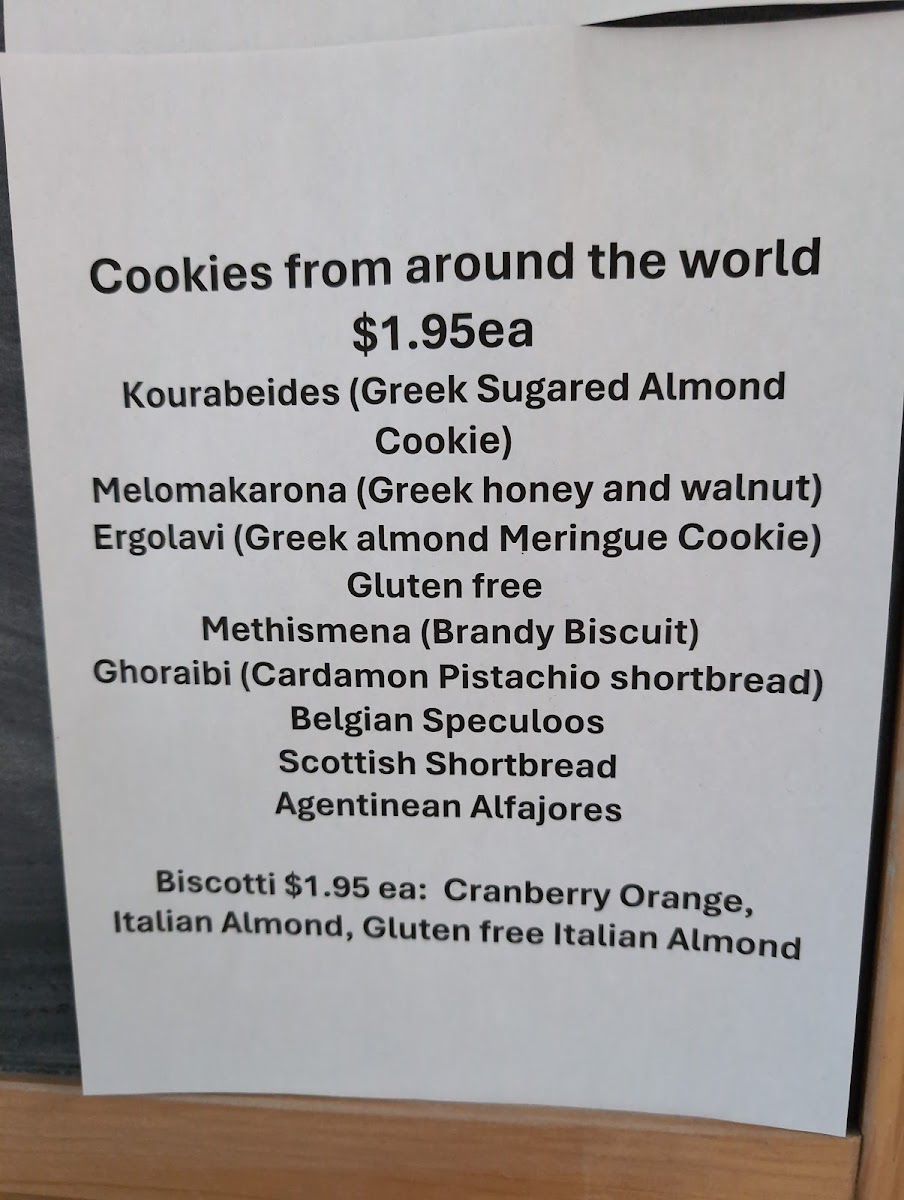Greek breakfast pastry. Custard filled and baked fresh to order. Topped off with a sprinkle of Cinnamon and Powdered sugar.